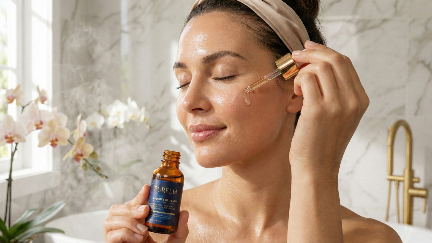 2. Apply: Dispense 2–3 drops of Purelia™ Anti Aging Serum.
