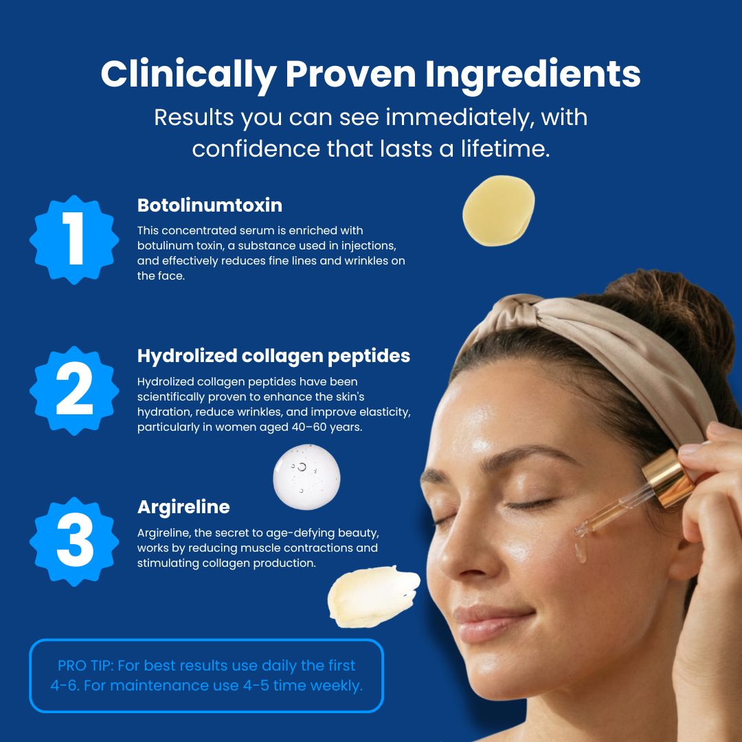 Our formula relies on three clinically proven powerhouses: Argireline (to stimulate collagen and reduce muscle contractions), Botulinum toxin (in a safe cosmetic form to soften deep lines), and Hydrolyzed collagen peptides (to enhance hydration and elasticity).